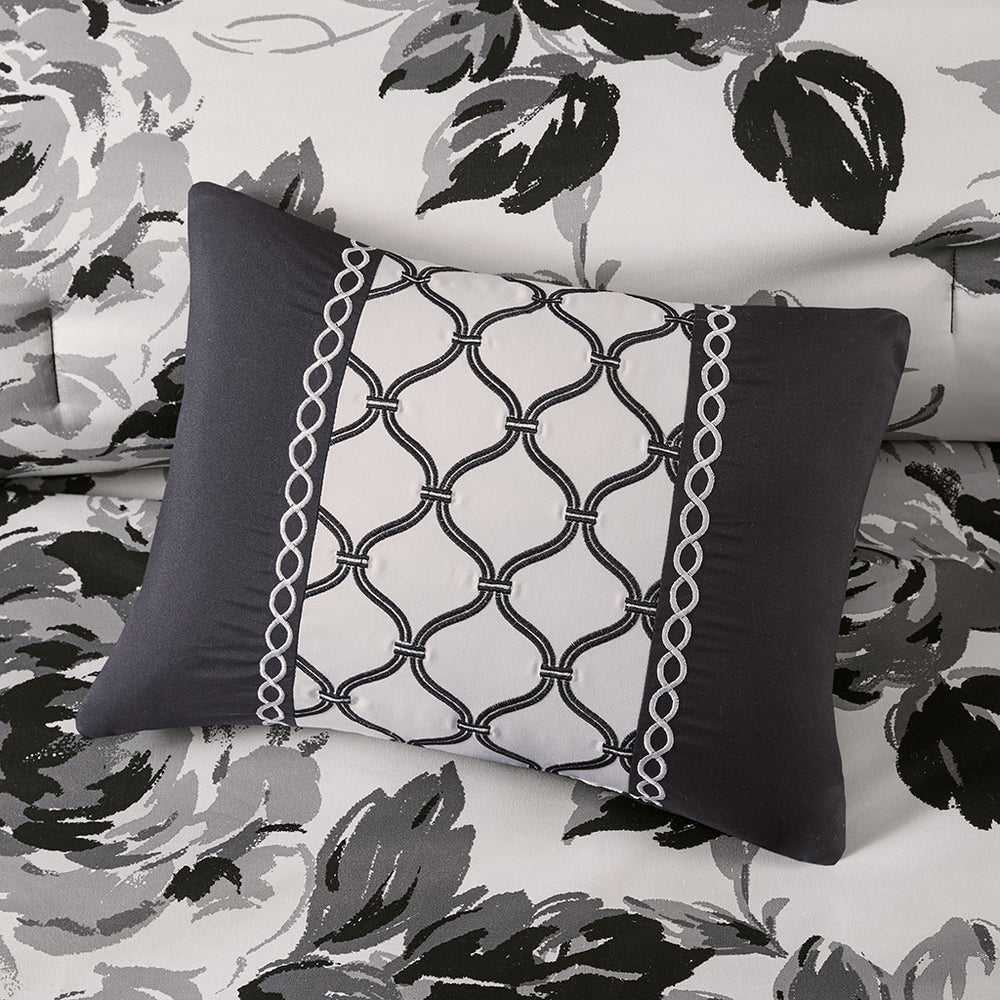 Transform your bedroom with the beautiful contrast of the Intelligent Design Dorsey Floral Print Comforter Set. The ultra-soft microfiber comforter and sham(s) flaunt a floral print in black and white for an elegant appeal. A solid black reverse on the comforter complements the top of the bed with a bold touch. Two decorative pillows with hypoallergenic filling are also included to complete the bedding set. Machine washable for easy care, this floral comforter set adds a stunning transitional look to your bedroom décor. This bedding set uses an antimicrobial treatment that provides built-in freshness protection, reducing the growth of odor causing bacteria to keep fabric lasting longer. |