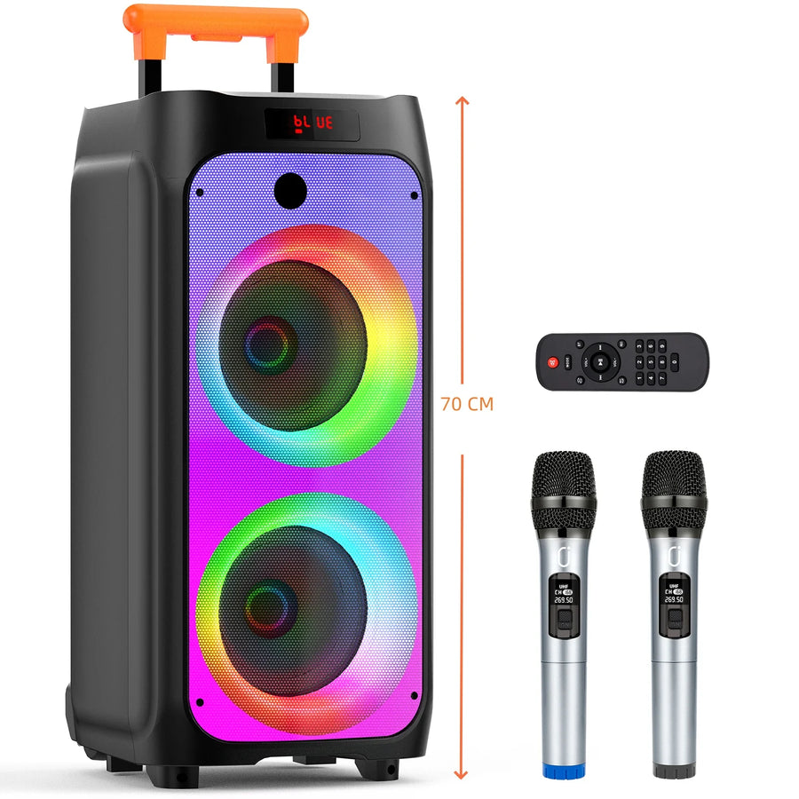 IPX4 splash-proof design whether you're gathering with friends on the patio or drinking by the pool, don't worry about getting your stereo wet.Two wireless UHF anti-whistling and no noise microphones (Enjoy a multi-person karaoke party without buying additional microphones) The wireless distance can be as far as 50M, breaking free from the bondage of wired. Infrared sensor remote control makes your operation easier, you can operate all the functions on the karaoke machine through the remote control.
